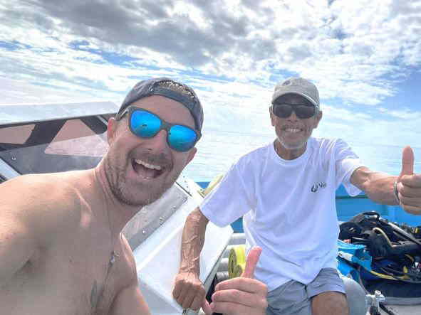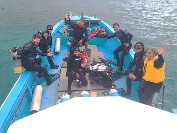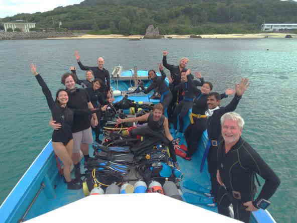 | 天 候 雨・曇 気 温 24度 水 温 26度 透視度 30m 今日は天気は雨の予報ですが、風は南風で風速4mで、水納島は穏やかな海です。 明日は、時化そうなので嵐の前の静けさでしようか。 せっかく水納島に来たので、恒例となっているクマドリカエルアンコうを見に行きました。 運よく、ニセゴイシウツボが居たり、ラッキーにダイビングになりました。 カナダから来ているロブさんとは、すっかり仲良しになりました。 仲良くなれたのは、日本人の様に日本語を話せるロブさんのお陰です。 ![]() 私の日本語のギャグを分かってくれるロブさんとは、気が合います。 今日も、とても楽しかった1日でした。 本部でダイビング! GO DIVE! |