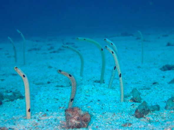 | 天 候 曇 気 温 26度 水 温 26度 透視度 30m 風が収まり、水納島に来ました。 砂地にポツンと有る握りこぶしほどの小石の傍に、カミソリウオがいました。 こんな無防備な場所に居るなんてビックリしました。 ムレハタタテダイが、並んでとてもきれいでした。 チンアナゴは相変わらず、雑草の様にどこでも見る事が出来ました。 殆ど警戒心の無いチンアナゴには、いつも感謝しかありません。 本部でダイビング! GO DIVE! |
