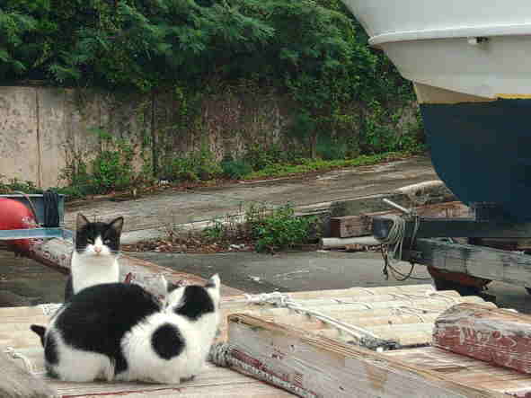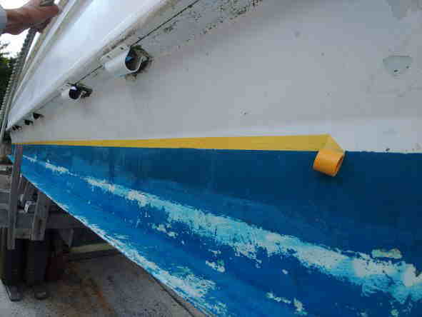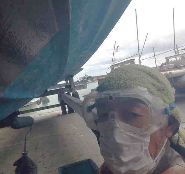 | 天 候 曇 時々 雨 気 温 20度 天気予報は曇マークなので、今日は、シードアー号の船底に塗料を塗ります。 喫水線より少し上にマスキングテープを貼りますが、船体が大きいので20mのテープを2本使います。 船底塗料は、普通りペンキと違い、金属に付着すると金属を痛めるので、プロペラとシャフトを新聞紙で覆います。 さあ、いよいよ塗装を始めます。 塗料は臭いも強く、船底の底を塗る時は仰向けになるので、時々塗料が顔に垂れてくる事が有り、体に付かないようにマスクもして完全防備です。 午前8時30分から塗り始め、小休止です。 塗装した部分は、色が濃く綺麗に見えます。 ところが、雨が降り始めました。 船体が濡れると塗装は出来ません。 天気予報では雨マークは出ていなかったので、作業を中断しました。 休憩していると、港の猫がやってきました。 何も言いませんが、顔は「何か食べるものを頂戴よっ。」と言ってます。 人には慣れませんが、普段から港に居る私達を知っているので、私達には警戒心が有りません。 雨は30分ほどで止み、船体もそれほど濡れていなかったので作業を再会しました。 12時になり、港でカップ麺とおにぎりの昼食を取って、又作業を始めました。 午後5時、やっと塗り終わって寝転ぶと、雲の間から青空が見えました。 船底塗料の作業は、終わりです。 長い1日でした。 本部でダイビング! GO DIVE! |