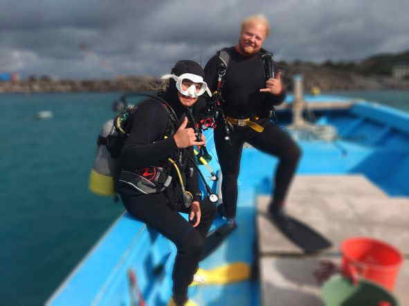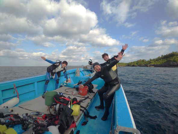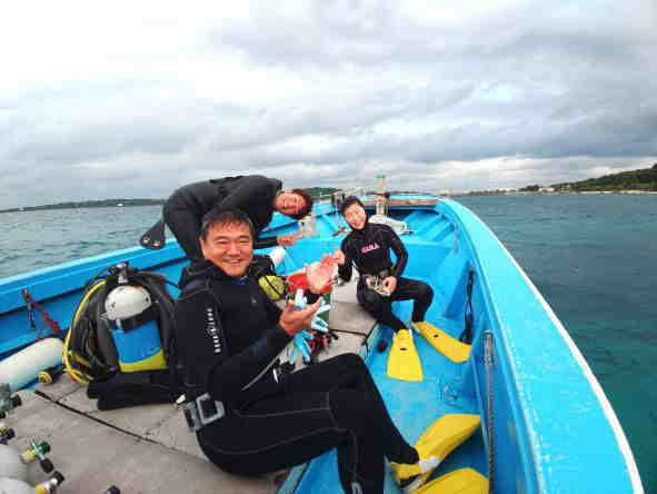 | 天 候 曇 気 温 17度 水 温 22度 透視度 25m 今日は比較的海が穏やかで水納島に来ました。 明日から荒れそうなので、水納島でのダイビングは、今日で一旦しばらくお休みになりそうです。 しばらく帰省で、休んでいたので、ゲスト様のショップの皆さんが、私の帰りをお待ち下さりとても有難い気持ちです。 1ダイブ目が終わりボートの上で休憩していると、クジラのジャンプが見えました。 何度も、何度も跳ねたり潮を吹いたりしていました。 予想外の出会いに、ビックリした1日でした。 本部でダイビング! GO DIVE! |