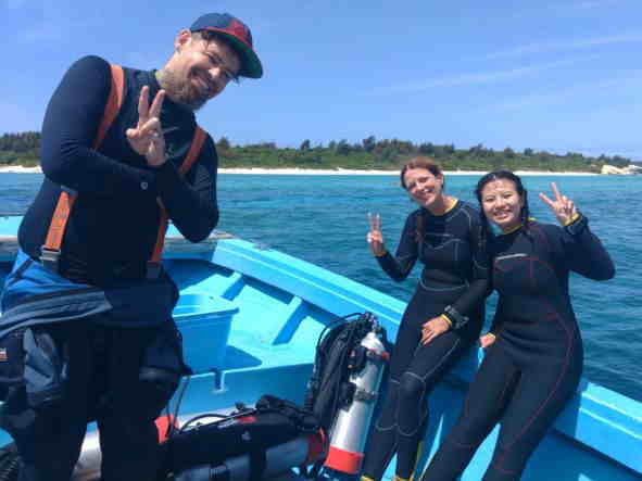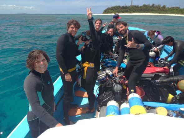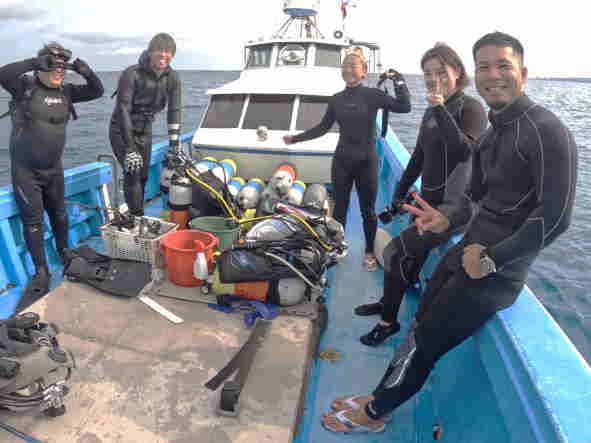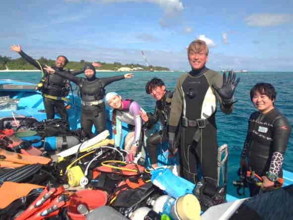 | 天 候 曇 晴 気 温 25度 水 温 23度 透視度 20m 最近は、カーチベエーのような強い南風が収まり、ボートも操船しやすくなっています。 今日は、天気の良い日も続いてます。 4月も中旬になり、水温も23度を越えてきました。 「アロハダイバーズ」様。 「クラブ アクシス」様 クラブアクシスの安間(写真右端)さんは、英語もペラペラでインバウンドで外国の方が多い昨今、安間さんが来て下さると、直ぐに通訳してくださるで、とても心強く、私の英会話の師匠です。 今日は、1ダイブ目は水納島の「オリーブ」で潜り、2ダイブ目は瀬底島で「イソバナ」ポイントダイビングした日でした。 本部でダイビング! GO DIVE! |