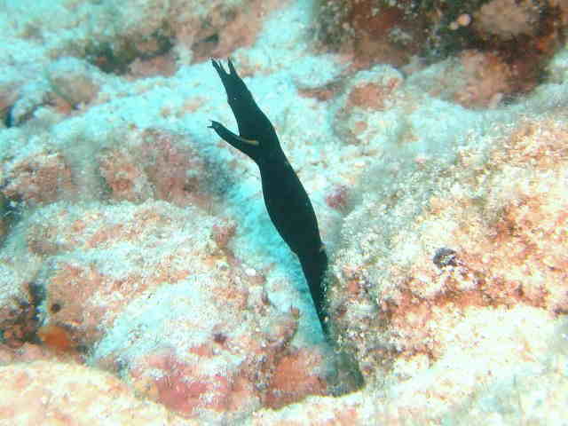 | 天 候 曇 雨 気 温 30度 水 温 28度 透視度 30m 今日は、久しぶりにハナヒゲウツボ探しの日になりました。 7月も、かなりの確率でハナヒゲウツボに出会えたので、今日も期待が高まります。 水納島は周囲3㎞辺程の小さな島ですが、リーフの周囲は水納島の2倍の6㎞も有ります。 周囲6㎞のリーフに囲まれた水納島で、ハナヒゲウツボが頻繁に現れる場所が決まっているのが、とても興味深い点です。 水納島の他の場所と比べても、ハナヒゲウツボが出る場所は特別変わって様子がないので、更に不思議です。 そんな事も気に掛けずハナヒゲウツボは、今日も顔を出してくれました。 見れた主な生き物 : セジロクマノミ ・ スカシテンジクダイ ・ ハナヒゲウツボ ・ カスミアジ等 本部でダイビング! GO DIVE! |