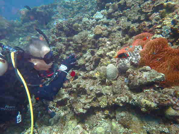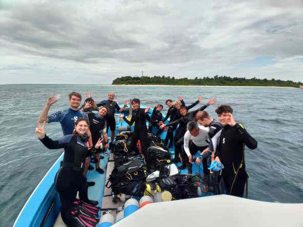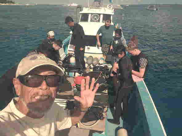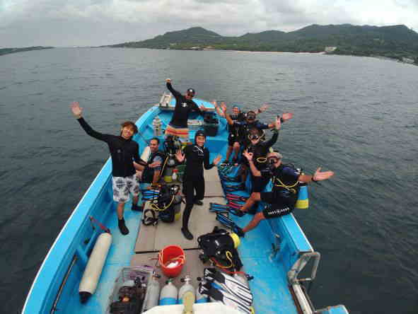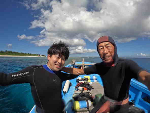 | 天 候 晴 気 温 31度 水 温 28度 透視度 30m 今日は、ご家族様で体験ダイビングを楽しみに来られたゲスト様とご一緒です。 とても元気なお母さまと、素敵なお嬢様です。 天気にも恵まれて、ダイビング日和です。 お母さまのご年齢が少し心配でしたが、私の心配をよそに、スムーズに潜行して行き、運動神経がとても良いお母さまです。 お嬢様は、少し耳抜きが上手く出来ませんでしたが、こまめに耳抜きをしていき、潜行も上手く出来てクマノミと写真を撮ったり、水中で私が出題するクイズに全問正解されたり、あっという間に時間が過ぎていきました。 お嬢様に、「何分潜っていたと思いますか?」と、尋ねると「20分くらいですか?」と、返事が返って来たので、ダイコンをお見せして「50分もダイビングを楽しみましたよ。」と、ご案内するとビックリされていました。 耳抜きが不安でダイビングを躊躇されていたお嬢様も、自信を持って頂けた様で良かったです。 ![]() 今日、全てのメニューが終わり、シードアー号をご利用くださった皆様と記念写真を撮りました。 本部でダイビング! GO DIVE! |